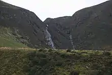 It is formed where the River Llyfnant falls from Llyn Penrhaeadr for approximately 525 feet (160 metres) into Cwm Rhaeadr in two waterfalls, and a series of cascades.[1] The tallest waterfall is a single horsetail drop of 300 ft (91 m).[2][3] This is sometimes mistakenly stated as 240 ft (73 m).[4]