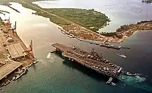 During the 1898 American Capture of Guam, Piti was the location of the formal Spanish surrender. The following year, the Americans established a Navy Yard at Piti, followed by a USDA agricultural experiment station in 1909. The Piti Navy Yard was one of the primary targets of Japanese bombing during the 1941 Japanese invasion, driving many residents to flee north on the road to Hagåtña. During the Japanese occupation of Guam, CHamorus were forced to expand Piti's rice fields to help feed the occupying troops. They were also forced to haul coastal defense guns into the Piti hillside, though they were not operational by the time of the American liberation in 1944.[3] The U.S. military substantially reconstructed and altered the shoreline of Apra Harbor as Guam became a major base for the remainder of the Pacific War. In 1948, the U.S. government declared an eminent domain taking of parts of Piti, as well as Sumay and Agat, for little or no compensation, moving the local population from the harbor shoreline.[4]