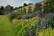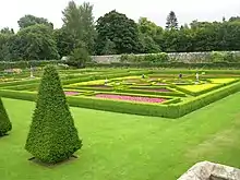 The garden is noted for its geometric parterres which vary in shape from a thistle to Sir Alexander Seton's coat of arms. Pitmedden also has several long, varied borders which run along the garden walls. Sir Alexander Seton and Dame Margaret Lauder, his wife, established a house and garden at the site in 1675.[3] The original house, together with the garden plans, was largely destroyed by fire in 1807.[4]