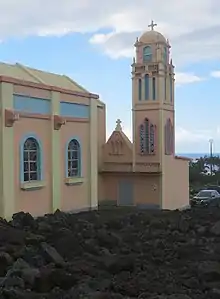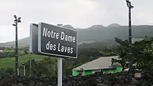 In April 1977, Piton Sainte-Rose was devastated by a lava flow from the Piton de la Fournaise, the active volcano of the island.[1] The village church was partly invaded by the lava flow but not destroyed.[2] The church was subsequently restored and renamed Notre Dame des Laves (Our Lady of the Lava). It is used for catholic services.[3]
