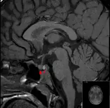 Normal pituitary gland on MRI (T1 sagittal without contrast enhancement). The arrow points at the posterior pituitary (intense signal), and the arrowhead at the anterior pituitary.