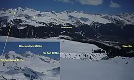 ![]() Piz Ault in the left part of the picture. A ski lift reaches to some 200m under the peak, the lifts starting at Disentis. In April at date of the picture the winter season would be finished already. | |