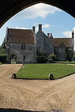 The farm house at Place Farm is a Grade I listed building. Dating mainly from the 15th century, it was renovated in the 19th. It is constructed of rubble stone, with a tiled roof. A room in the house has a frieze which carries the initials AM, that probably reference the collector Alfred Morrison who owned the estate in the 19th century.[10] The estate buildings which form three sides of a courtyard are listed Grade II.[11] The tithe barn, which at 200ft long is reputed to be the largest barn in England,[3][12] has a Grade I listing.[13] The barn was originally tiled, but now has a thatched roof,[lower-alpha 2] which was renewed in 1971.[3] The barn is thirteen bays long, with a cruck truss roof structure.[13] The inner and outer gatehouses are also listed at Grade I.[14][15] Historic England considers the complex at Place Farm, "one of the finest surviving groups of monastic grange buildings in England".[13]