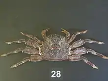 There are key differences in morphology and mitochondrial DNA that distinguish the scaly rock crab from other crab species it is closely related to. The crabs sometimes get mistaken for the Sally-Light-Foot crab (Gapsus albolineatus).[5] The first morphologic difference occurs in the first zoeal stage in development.[3] There is a distinct shape of the labe from the coaxial joints of the walking legs.[3] They have a body width of five to six centimeters across.[5] Their oval body is convex and covered with small bumps giving it their distinctive "scales".[5] The pincers tend to be short and slender with long walking legs that are fringed with short hairs tipped with pointy claws.[5] Mitochondrial DNA shows a clear genetic difference between P. squamosa and other species closely related to it.[3] The crabs tend to have a large mixture of colors: shades of brown, blue, purple, and orange.[1]