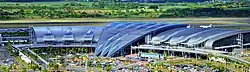 The new terminal, which cost US$306 million, is in line with the "Maurice Ile Durable" concept. Environmental and ecological aspects taken into consideration include using solar energy collected by photovoltaic cells, recovering rain water, integrating nature to the heart of the building, and including thermo-insulated facades to reduce heat gain.[5] The terminal covers an area of 57,000 square meters and is equipped with five boarding gates with airbridges, including one compatible with the large Airbus A380, check-in desks for departing passengers, immigration counters, and baggage carousels.[6]