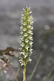 Platanthera elegans is a species of orchid known by several common names, including elegant piperia, coast piperia, hillside rein orchid, and hillside bogorchid. This is a showy flowering plant native to western North America.[1][2] It grows from a caudex tuber and sends up a thick stem just under a meter in maximum height. The stem is topped with a cylindrical spike inflorescence of densely packed flowers with curving white to greenish-yellow petals.[3][4][5] Coastal individuals are noticeably thicker and have more flowers than those that grow further inland; it is uncertain if these are variants, subspecies, or even separate species. They are both currently treated as P. elegans. Other species of Plantanthera, notably the endangered species P. yadonii are quite similar in appearance to some populations of this species.