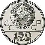 Eleven commemorative platinum coins with a 150-ruble face value were minted, some as part of a series commemorating the 1980 Summer Olympics. The price for proof platinum coins of the USSR typically exceeds $1,500 per coin.[1]