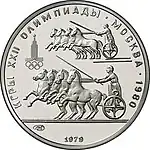 Reverse: Two chariots, left – the emblem of games, bottom – the mint trademark and the minting year, along the rim: "The Games of the XXII Olympiad. MOSCOW. 1980" Design: Ermakov Mint: Leningrad Mint (LMD).[7] |
