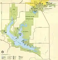 Most of the National Recreational Area is taken up by the 2,350 acre (950 ha) Lake of the Arbuckles and the prairie and woodland along its shores. The scenic lake is a principal water supply reservoir for the city of Ardmore, some 30 mi (48 km) to the southwest. Lake of the Arbuckles was built by the Bureau of Reclamation in 1966 by impounding Rock Creek. Water quality and clarity are excellent. The Oklahoma Department of Wildlife Conservation has rated the lake as the best for bass fishing in the state.[15] The lake features 36 miles of shoreline. Fishing is permitted year-round for crappie, catfish, largemouth bass, white bass and bluegill. Facilities include three campgrounds for tents and RVs, picnic areas, public restrooms, boat docks and ramps, and several miles of multi-use trails.[14] Hunting is also allowed, and typically hunted species are quail, turkey, squirrel, rabbit, dove, ducks, geese, and deer. However, due to heavy hunting pressure and small area size, game is declining and trapping is prohibited. Hunting regulations and certain special rules (such as not killing male deer), are designed to regulate the hunt.[16]