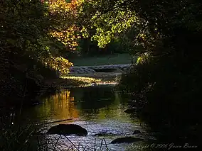 Travertine district, embracing the old Platt National Park, is like a large city park, three miles long and less than one mile wide. A narrow road circles the district, passing by parking areas, camp and picnic grounds, the Travertine Nature Center, swimming holes, and springs. A bison pasture was constructed by the Civilian Conservation Corps in the 1930s.[12][13] Travertine Creek, joined by Rock Creek, flows through the district, rising in Antelope Springs and Buffalo Springs at the eastern end of the park. The springs produce 5 million gallons per day (20 million liters) of cool, crystal clear-water and form Travertine Creek which is joined by Rock Creek about 2 miles from its source. A number of other fresh water and mineral springs contribute to Travertine and Rock Creek as they flow through Travertine District, dropping in small waterfalls over several ledges. Several miles of walking and biking trails wind through the heavily forested creek bottomland. Very popular and often crowded in summer, the Travertine district has been described as an oasis in the Oklahoma prairie.[14]