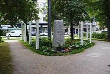 40 years after the end of the war, a granite memorial stone designed by Karl Oppenrieder and dedicated to "The victims in the resistance against National Socialism" was erected on this site.[3] In 1962, it was initially erected as a temporary measure on the Platz der Opfer des Nationalsozialismus (Place for the victims of National Socialism). After a stele with an eternal light was erected there, the stone came here in 1985.[4] The artist Wolfram P. Kastner planned to erect another monument on the square. Around the square he wants to place names, portraits and life stories of people who rebelled against the Nazi regime on a "yellow ribbon of remembrance".[5][6] It was opened in July 2016[7] and will probably be preserved until 2019.[1][2]