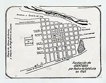 Most cities constructed by the Spanish conquistadores were designed in a standard military fashion, based on a grid pattern[3] taken from the Roman castrum, of which one block would be left vacant to form the Plaza de Armas. It is often surrounded by governmental buildings, churches, and other structures of cultural or political significance.[4][5] The name derives from the fact that this would be a refuge in case of an attack upon the city, from which arms would be supplied to the defenders.