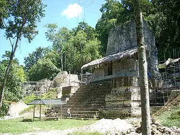 The plaza was investigated by Patrick Culbert of the University of Pennsylvania in 1963, concentrating on the plaza's stratigraphy and also clearing the palace on the southern side.[12] Major excavations of the plaza started in January 1983 under Vilma Fialko, with the objective of consolidating the seven temples on the east side of the plaza, and palace structure 5D-92 on the southeast corner.[13]