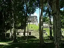 The west side of the plaza is enclosed by the remains of an E-Group complex facing westwards onto a neighbouring plaza.[20]