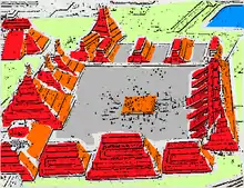 The Central Patio is the inner courtyard of the plaza, enclosed by the surrounding buildings.[17] It has a surface area of 8,000 square metres (86,000 sq ft) and inclined slightly so as to drain runoff rainwater from the northeast corner, towards the Temple III reservoir.[8] The seven temples are aligned along the east side of the patio.[18] It is bordered on the south by a palace complex.[19] On the north side it is enclosed by a number of structures that formed a triple ballcourt.[18] The west side of the Central Patio is formed by the rear of an E-Group complex.[20]