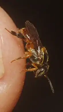 Plebeia is a genus of mostly small-bodied stingless bees, formerly included in the genus Trigona. Most of the ~45 species are placed in the subgenus (Plebeia) (s.s.), but there also are four species in the subgenus (Scaura). They differ in only minor structural details, primarily of the hind leg, from other genera that were formerly treated as constituents of Trigona. In some classifications, the genus Schwarziana is treated as a subgenus within Plebeia, but recent morphological analyses indicate that Schwarziana is a distinct lineage, while Plebeia is paraphyletic.[1]