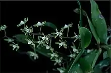 Plectorrhiza, commonly known as tangle orchids,[2] is a genus of three species of flowering plants from the orchid family, Orchidaceae and is endemic to Australia. Orchids in the genus Plectorrhiza are epiphytic or lithophytic herbs with short stems, long, tangled roots, short leathery leaves and small flowers on a short, thin flowering stem. Two species occur in eastern Australia and one is endemic to Lord Howe Island.