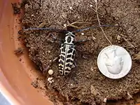 The adult cottonwood borer is a large longhorn beetle with a black-and-white coloration and black antennae as long or longer than the body.[5] The white portions are due to microscopic masses of hair.[6] The larvae have legless, cylindrical, creamy-white bodies with a brown-to-black head and grow up to 38 millimetres (1.5 in) long.