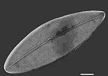Pleurosigma pacificum is a naviculoid diatom, a type of photosynthetic protist (or alga) that is similar in shape to those of the genus Navicula, said to be shaped like a boat.[2] In particular, naviculoid diatoms of the genus Pleurosigma usually have a sigmoid valve or raphe, in the shape of a sigmoid function or the letter S.[3] The species P. pacificum is characterized by lanceolate valves, around 45.0–51.1 μm long and 13.0–15.6 μm wide, that taper gradually towards subacute ends. Their raphe is straight, filiform, slightly curved near the poles. The center of the valve is round, while the terminal area is shaped like a funnel.[1]