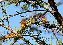 In Ethiopia, Plicosepalus sagittifolius can be found in coastal and deciduous bushland, Acacia and Acacia-Commiphora bushland and woodland. The most common hosts are Acacia mellifera and other Acacia-species, but it sometimes also parasitises on Albizia or Commiphora.[1] The caterpillars of Iolaus jacksoni, Jackson's sapphire, feed on Plicosepalus-species, including P. sagittifolius.