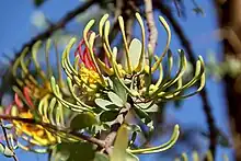 One or a few umbels of three to seven (sometimes up to twelve) flowers each on a dull purple common stalk of ½–1⅔ cm long are set at the tip of the short shoots, which are leafy at their base. The dull purple stalks of the individual flowers are ½–1 cm long. The fully developed flowerbuds are 4½–5 cm long, have a thickened, campanulate, green receptacle of 2½–4 mm long, on top of which is an inconspicuous green ring-shaped calyx of ½–1 mm high. The corona is a greenish yellow, in the lower 6–8 mm widened and slightly S-shaped, further to the tip an up-curved tube of 3–3½ cm long, and again wider at the tip. The corona opens suddenly into fully free petals that are strongly curled at the receptacle, initially bright yellow and sometimes reddish at the foot, remaining yellow or aging to orange-red. When open, the orange, pink or red filaments topped by 7–9 mm long anthers become visible. Style and stigma are equally bright red as the stamens.[1][2][3]
