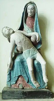 The church contains several old statues. On the north side of the church there is a pietà and statues of Saint Barbara, Saint Joseph and John the Baptist and on the south side statues of Saint Yves and Francis of Assisi as well as a study of a seated Saint Anne carrying the Virgin Mary who in turn carries the baby Jesus.[3]
