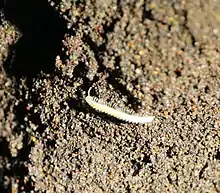 | A white Plumatyla humerosa millipede crawls on the floor of Lava River Cave | |