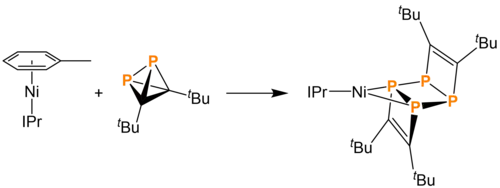 tBu2C2P2 can also be dimerized using nickel complexes to form a variety of exotic structures. tBu2C2P2 reacted with 1 equivalent of Ni(CpR)(IPr) (IPr = 1,3-bis(2,6-diisopropylphenyl)imidazolin-2-ylidene, R = H, CH3, 4-(CH3CH2)-C6H4) generates 0.5 equivalent of a tetracyclo-compound. Upon addition of another equivalent of the same nickel complex, a butterfly-like geometry is adopted, with two nickel atoms coordinated to opposite phosphorus atoms and two coordinated to adjacent phosphorus atoms on different four membered rings. This butterfly-structured compound is a dark red color. The reaction to the butterfly structure is believed to depend on kinetic access to the middle P-P bond. Bulky substituents on CpR kinetically hinder the P-P bond cleavage and transformation into the butterfly-structured product.