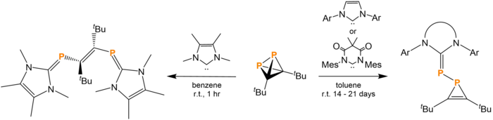 tBu2C2P2 can be used a retron to form phosphirenes or phosphaalkenes with the addition of 1 equivalent or 2 equivalents of N-heterocyclic carbenes (NHC), respectively. Upon the addition of 1 equivalent of IPr, IMes, or MesDAC (1,3-bis(2,4,6-trimethylphenyl)diamidocarbene), tBu2C2P2 undergoes ring opening at one phosphorus atom's P-C bonds, creating structures with a bridging P-P bond between the NHC and the phosphirene. IBO calculations and crystallographic evidence support the assignment of double bonding to the P=C bond to resultant molecule. This reaction is very slow, taking several weeks to reach completion.
