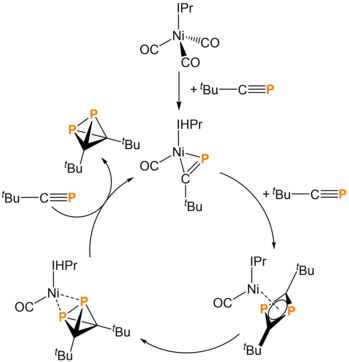 In 2019, Wolf and coworkers reported the synthesis of tBu2C2P2 through the use of a metal catalyst. Ni(IPr)(CO)3, upon addition of 1 equivalent of tert-butylphosphaacetylene (tBuCP), loses two carbon monoxide ligands. The addition of a second equivalent of tBuCP generates the 1,3-diphosphacyclobutadiene ligand, now binding with η4 hapticity. Density functional theory calculations into the catalytic cycle suggest that the 1,3-diphosphacyclobutadiene isomerizes into the desired tetrahedrane. Upon addition of a final tBuCP, (tBu2C2P2) is released and the catalytic cycle can begin again.[4]