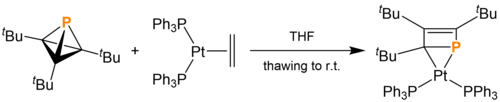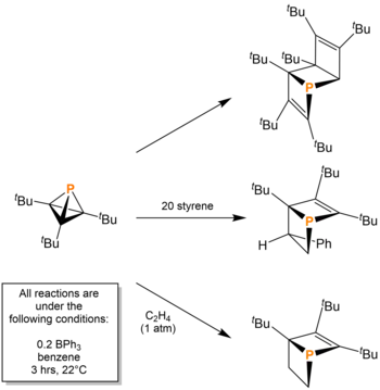 The addition of 0.2 equivalents of triphenylborane in benzene can produce several cycloadducts. In the absence of exogenous reagents, tBu3C3P dimerizes into a ladderane-like compound with a P-P bond. In the presence of excess styrene or an atmosphere of ethylene, [4 + 2] cycloadditions occur to give 1-phosphabicyclo[2.2.0]hexenes.[11]
