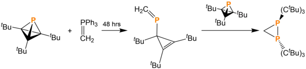 Reaction of tBu3C3P with the ylide Ph3P=CH2 over 48 hours and with heat induces cage opening in the same manner as the silylene reaction to generate H2C=P(tBuC)3. Reaction of this product with tBu3C3P generates the symmetric product (tBuC)3P(C)P(tBuC)3.[13]
