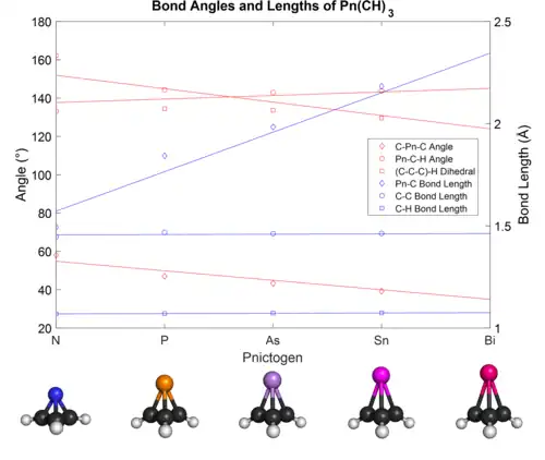 Consistent with a perturbation of the pnictogen residing above a C-C-C ring, the C-Pn bonds elongate from 1.493 Å to 2.289 Å, and C-Pn-C angle decreases from 58.0° to 37.1° as heavier congeners are used. This is due to the larger atomic radius of the heavier pnictogens. The H-[C-C-C plane] angle increases from 9.1° to 31.1°, which is also attributed to the diffusivity of the heavier congener's orbitals.
