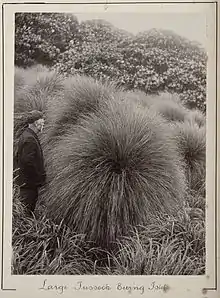 | Botanist Leonard Cockayne with Poa litorosa on Ewing Island, November 1907 | |