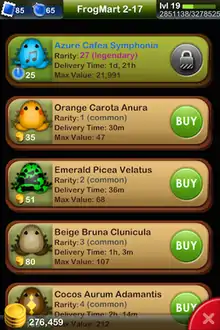 Level 1-4 frogs are labeled "common", level 5-8 frogs are labeled "rare", level 9-12 frogs are labeled "endangered", and level 13+ frogs are labeled "legendary". Frogs unlock slowly as you level up, and can be obtained in numerous ways. Frogs leveled 1-8 can be bought daily from the FrogMart with coins. Frogs leveled 9 and up can be bought from the FrogMart with potions when available, gifted, or found at the Pond.