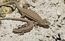 Podarcis liolepis, the Columbretes wall lizard or Catalan wall lizard, is very similar to the other lizards in the genus Podarcis. This species was formerly described as a subspecies of the Iberian wall lizard, but has now been elevated to species status.[1][2] These are slender lizards with long tails, narrow tapered heads and long thin toes, and stout legs. Colours are variable, although generally grey-brown. Often very subtle spots and stripes along the back and flanks can be seen and these can be more distinguished in the female. The underside is a much lighter cream or beige with sometimes a reddish tint. Adults grow 15–20 cm in length from the nose to tip of the tail. Body length can be a little as one third of the total body length, the tail making up the other two thirds.[3]