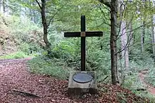 Graves two through four lie in the Svetel Woods (Slovene: Svetelov gozd) along a path on the south slope of Golaš Hill, facing Dobrava Hill. Grave two is east of a water catchment installation, grave three on the slope of a sinkhole, and grave four at the top of a small rise. They contain the remains of murdered Ustaša officers from the prisoner of war camp in Kamnik.[5][6][7] The graves are also known as the Svetel Woods Postwar Victims Grave (Slovene: Grobišče povojnih žrtev v Svetelovem gozdu). They are marked by a metal cross and a bronze memorial plaque mounted on a concrete base, arranged by the Municipality of Kamnik in 1994.[8]