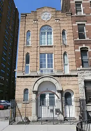 Congregation Masas Benjamin Podhajce was founded in 1895 by Austrian Jews from Podhajce, Galicia. In 1926, they purchased the building on 1st Street and consecrated it as their new synagogue.[1] During the 1920s, another congregation, Rodeph Shalom Independent Pohajce, shared the building with Masas Benjamin Podhajce. Neither of these congregations exist anymore. In the 1980s, a group of Lithuanian Jews named Kochob Jacob Anshe Kamenitz used the synagogue. This congregation was organized in 1892 and had previously met at 248 Division Street, 385 Grand Street and 54–56 Pitt Street. The building was empty from 1985 to 1990, when it was taken over by Congregation Beth Yitzchoch. In 1995, the building was rented as a space for visual and performing arts. The building was later repurposed to residential use.[2]