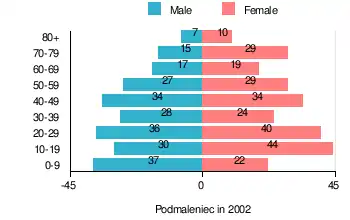 According to the 2002 Poland census, there were 483 people residing in Podmaleniec village, of whom 47.8% were male and 52.2% were female. In the village, the population was spread out, with 24.2% under the age of 18, 35.8% from 18 to 44, 21.1% from 45 to 64, and 18.6% who were 65 years of age or older.[1]