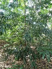This species grows in scattered subpopulations. It is part of the rainforest understory. The seed is dispersed by southern cassowary (Casuarius casuarius) and musky rat-kangaroos (Hypsiprymnodon moschatus).[1]