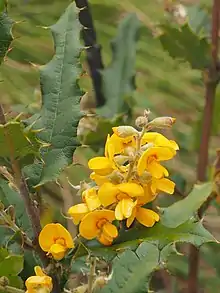 Podolobium aestivum is an upright shrub 1–2.5 m (3 ft 3 in – 8 ft 2 in) high, lower leaf surface and young stems covered with flattened or spreading hairs. The leaves are arranged opposite, usually 2.5–8 cm (0.98–3.15 in) long, 10–20 mm (0.39–0.79 in) wide, upper surface shiny and veined, margins more or less evenly lobed and sharply pointed. The stipules are stiff, sharp, curved, and up to 3 mm (0.12 in) long. The flowers are borne in racemes in leaf axils, occasionally longer than the leaves, bracts are oval-shaped and small. The orange corolla is about 10 mm (0.39 in) long and the calyx about 6 mm (0.24 in) long. Flowering occurs in spring and summer, and the fruit is an oblong shaped pod, more or less straight, 10–14 mm (0.39–0.55 in) long, about 3 mm (0.12 in) in diameter with short, soft hairs.[2]