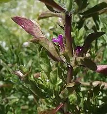 The inflorescence is a headlike cluster, each flower accompanied by long, pointed sepals lined densely with long, straight, white hairs. Each lipped tubular flower is 1 to 2 centimeters in length and mostly pinkish-purple with a white throat spotted with purple and sometimes yellow.