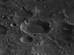 This is a circular crater with a somewhat worn rim. A small craterlet lies across the southern rim, and pair is located long the northeastern rim. The interior floor has a slightly lower albedo than the surroundings, and is level and nearly featureless.