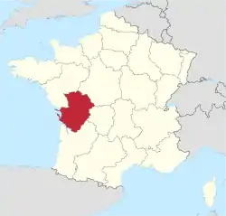 Poitou-Charentes (French pronunciation: [pwatu ʃaʁɑ̃t] ⓘ; Occitan: Peitau-Charantas; Poitevin-Saintongeais: Poetou-Chérentes) was an administrative region on the southwest coast of France. It is part of the new region Nouvelle-Aquitaine.[2] It comprised four departments: Charente, Charente-Maritime, Deux-Sèvres and Vienne. It included the historical provinces of Angoumois, Aunis, Saintonge and Poitou.