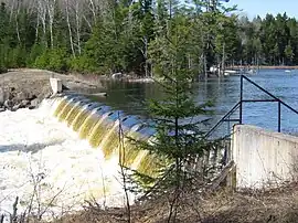 In early spring the reservoir water level is lowered to prevent flooding from spring runoff. During this time you can see part of the Pokiok gorge where the falls once ran.