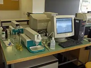 The Polarograph uses an electrolytic cell consisting of an electrode or microelectrode small area, generally of the mercury drop type, which is a very fine capillary tube through which mercury flows slowly, which comes in the form of small droplets, which fall on the same surface of a much broader element, which is the other electrode . When one applies a variable voltage in this cell, the electrode's large area remains unchanged, while the microelectrode undergoes a change of potential, ( i.e. is polarized). It also has a potentiometer coupled to the motor that moves the recording paper so that a certain voltage variation corresponds to a constant length of recording paper, and a galvanometer suitable for measuring the intensity of the electric current, whose response is transmitted to the actuator that moves the needle of the recorder. The technique used is called polarography.[1] The Czech chemist and Nobel Prize winner Jaroslav Heyrovský invented it.
