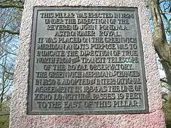 This pillar was erected in 1824 under the direction of the Reverend John Pond, MA, Astronomer Royal. It was placed on the Greenwich Meridian and its purpose was to indicate the direction of true north from the transit telescope of the Royal Observatory. The Greenwich Meridian as changed in 1850 and adopted by international agreement in 1884 as the line of zero longitude passes 19 feet to the east of this pillar.