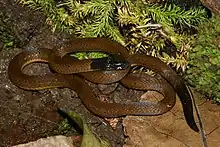 Dorsally pale brown, with two series of round black spots, which may be light-edged. Dorsal surface of head black, nuchal collar black, and dorsal surface of tail black. Ventrals white, subcaudals white, and terminal caudal scale white.