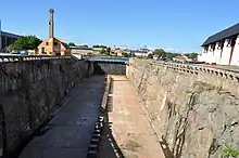 While dry docks in other countries where let dry by the tidal water going out, in this dock water pumps are used, as the Baltic Sea doesn't have any significant tide. The dry dock was built by 600 men and was an international sensation for its advanced design.[3] The drydock has its name from Christopher Polhem, who constructed it. It is described as the Eighth Wonder of the World by the Karlskrona shipyard history association. The water pumps were created by the shipbuilding master Charles Sheldon, they were of a kind already used in Swedish mines.[4] Before converting to steam power in the 19th century around 100 men were required to power the pumps.[2]