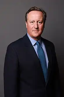 This article concerns the policies, views and voting record of David Cameron, Foreign Secretary in the Sunak ministry (since November 2023) and former Prime Minister of the United Kingdom (May 2010 to July 2016). Cameron describes himself as a "modern compassionate conservative" and has said that he is "fed up with the Punch and Judy politics of Westminster".[1] He has stated that he is "certainly a big Thatcher fan, but I don't know whether that makes me a Thatcherite."[2] Our Society, Your Life, a 2007 policy statement for the Conservative Party launched shortly after David Cameron became leader of the party, has been seen by some (such as Richard Kelly, head of politics at Manchester Grammar School[3]) as a triangulation of Conservative ideology with that of Tony Blair's New Labour, linking into the idea of the Third Way and an attempted revival of one-nation conservatism.[4] There have been claims that he described himself to journalists at a dinner during the leadership contest as the "Heir to Blair",[5] and Cameron stated in 2005 that he did not intend to oppose the Labour government as a matter of course, and will offer his support in areas of agreement. He also wants to move the Conservatives focus away from purely fiscal matters, saying "It's time we admitted that there's more to life than money, and it's time we focused not just on GDP, but on GWB – general well-being".[6] However, commentators have questioned the degree to which Cameron and his coalition have embodied this, instead locating them in the intellectual tradition of Thatcherism.[7][8] However, Cameron has claimed to be a "liberal Conservative", and "not a deeply ideological person".[9]